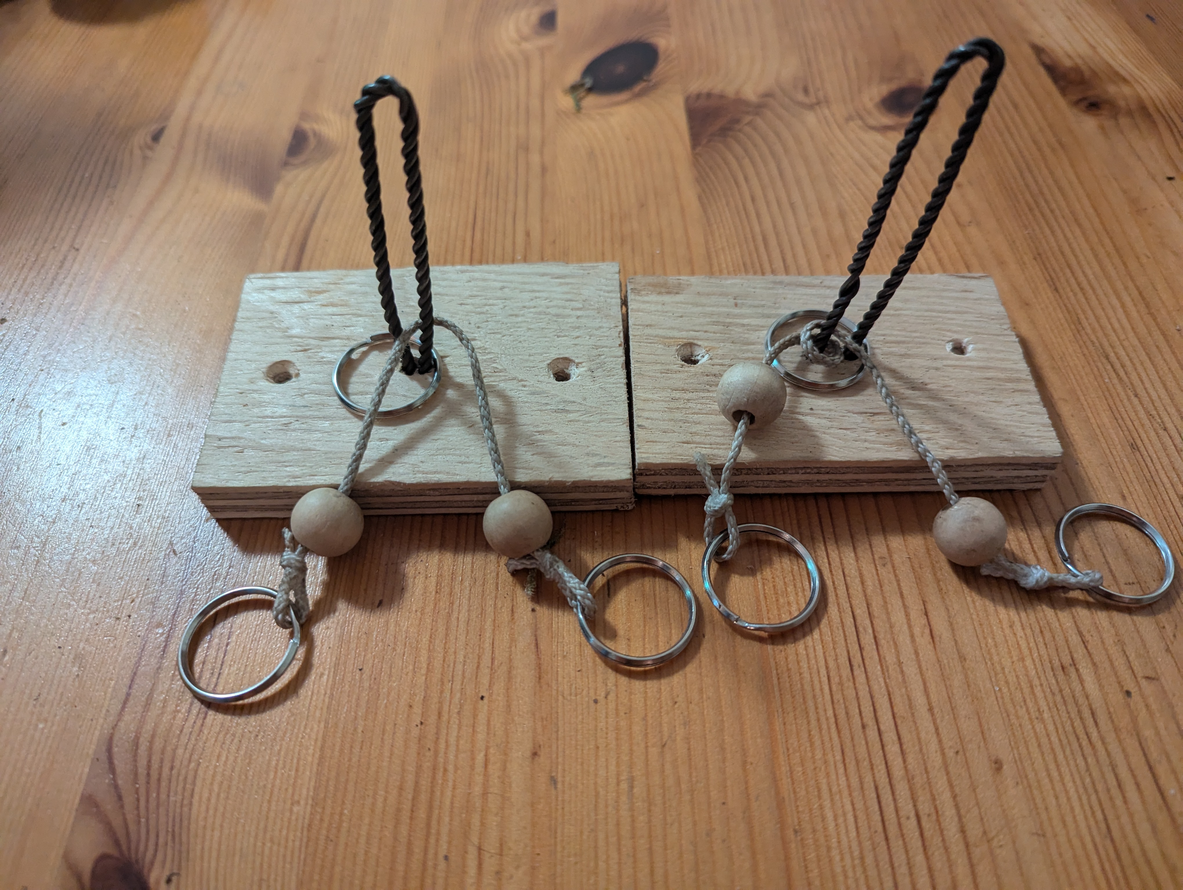 Studera videon som beskriver hur pusslen Eureka och Wits end fungerar. Välj den ena av dem (jag valde Wits end för upptäckare och Eureka för äventyrare och utmanare), och bygg den. Använd en skruvdragare och ett skruvstäd (alt. en plattång) för att tvinna en dubbel eller trippel najtråd, c:a 25cm lång. Borra två 4mm hål med c:a 4mm mellan mitt på träbiten. Böj den tvinnade najtråden på mitten, stick ändarna igenom hålen och böj dem på baksidan. Stick polyestertråden igenom bågen (slå ett extra varv om du bygger Eureka). Trä en träpärla på vardera sidan och fäst en nyckelring i vardera änden. Sätt en nyckel på den sista ringen och pussla in den innanför snöret. Använd videon som hjälp och tänk baklänges. Montera fast pusslet i rummet, utom räckhåll från lådan.